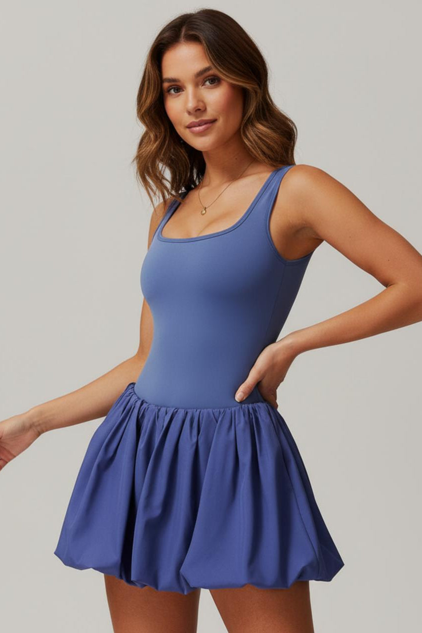 SVL Padel Bubble Belle Dress in royal blue, designed with a playful bubble hem, moisture-wicking fabric, and built-in shorts for stylish performance during padel matches