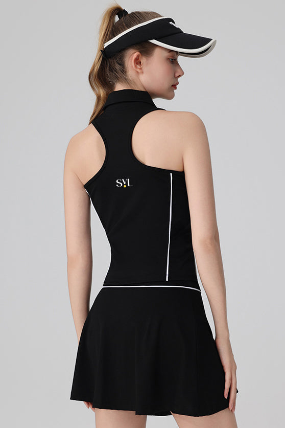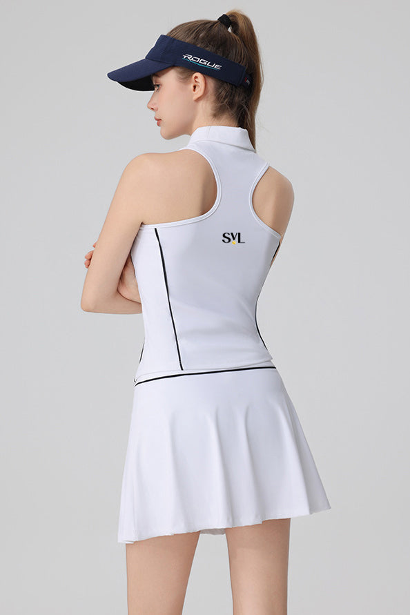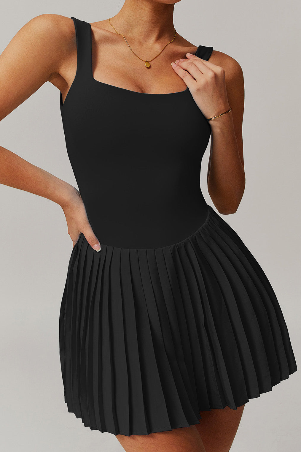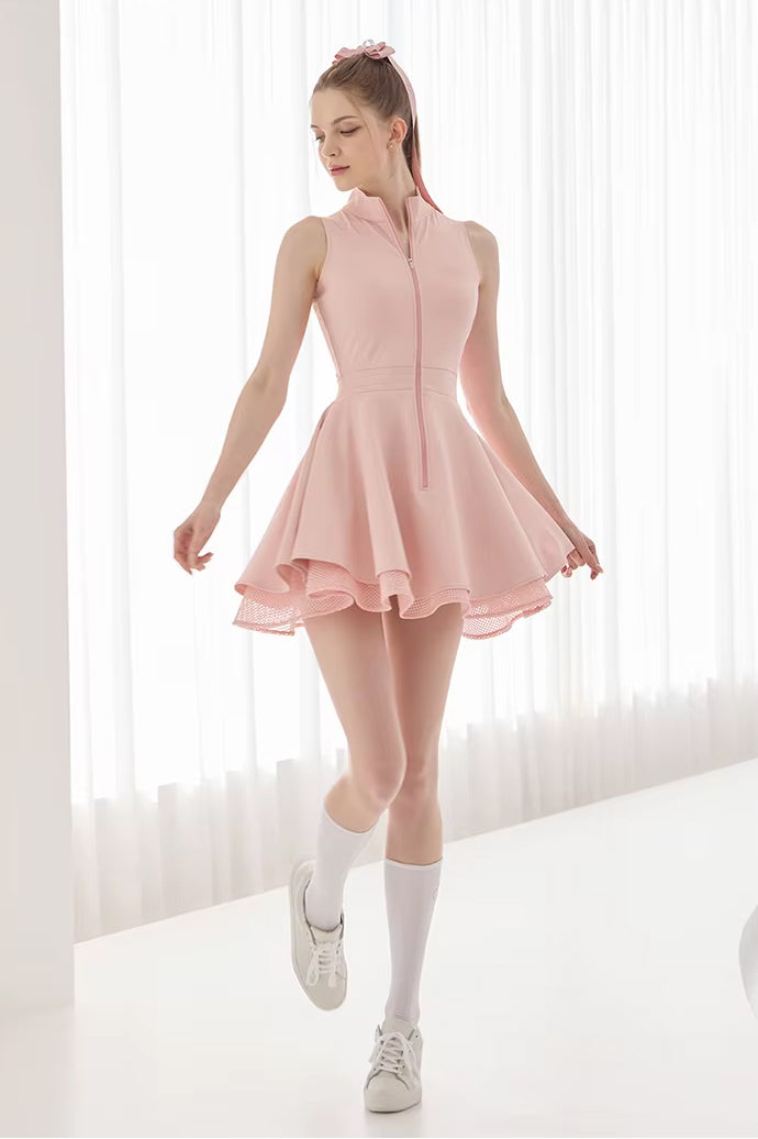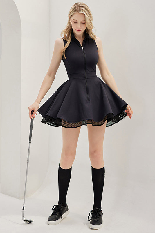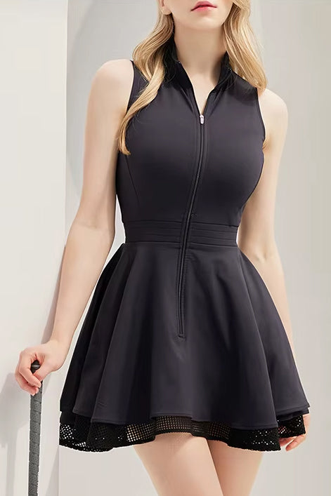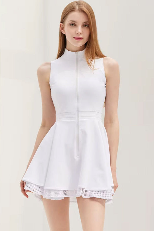 Turn heads with the Zesty Zipper Dress, featuring a sporty zip-up front, chic collar design, built-in bra and a flared skirt with built-in shorts and pockets. Perfect for playing padel, active days, or casual outings.